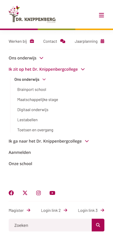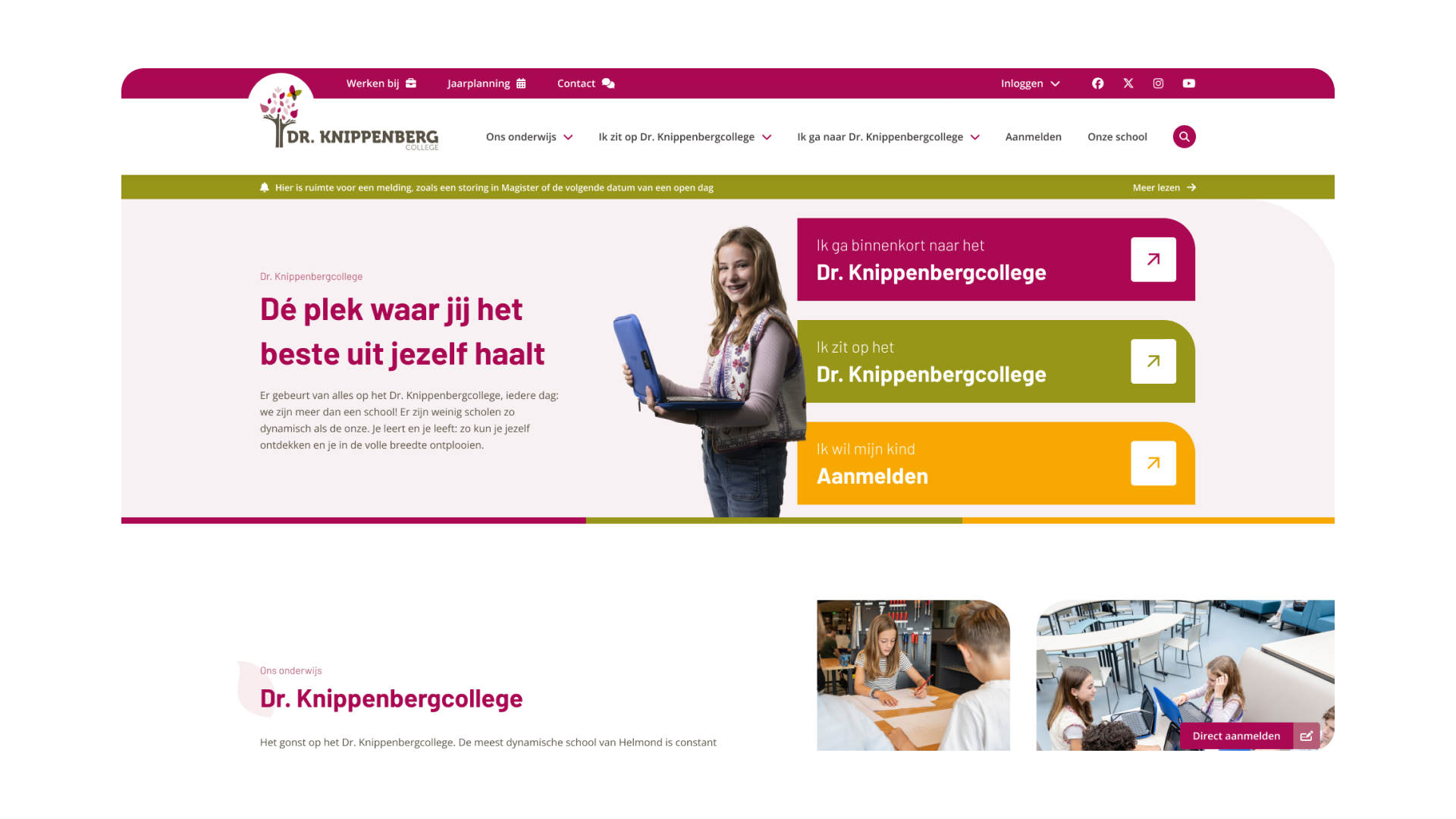 Tijdens mijn dienstverband bij JKC als grafisch vormgever heb ik het webdesign voor o.a. Dr. Knippenbergcollege verzorgd, als onderdeel van het OMO-traject. We werkten met één multi-inzetbare basis die per school een eigen gezicht behoudt; voor de Knip betekende dat een herkenbare identiteit met focus op doorstroom voor groep-8, praktische info voor huidige leerlingen en snelle contactmogelijkheden.