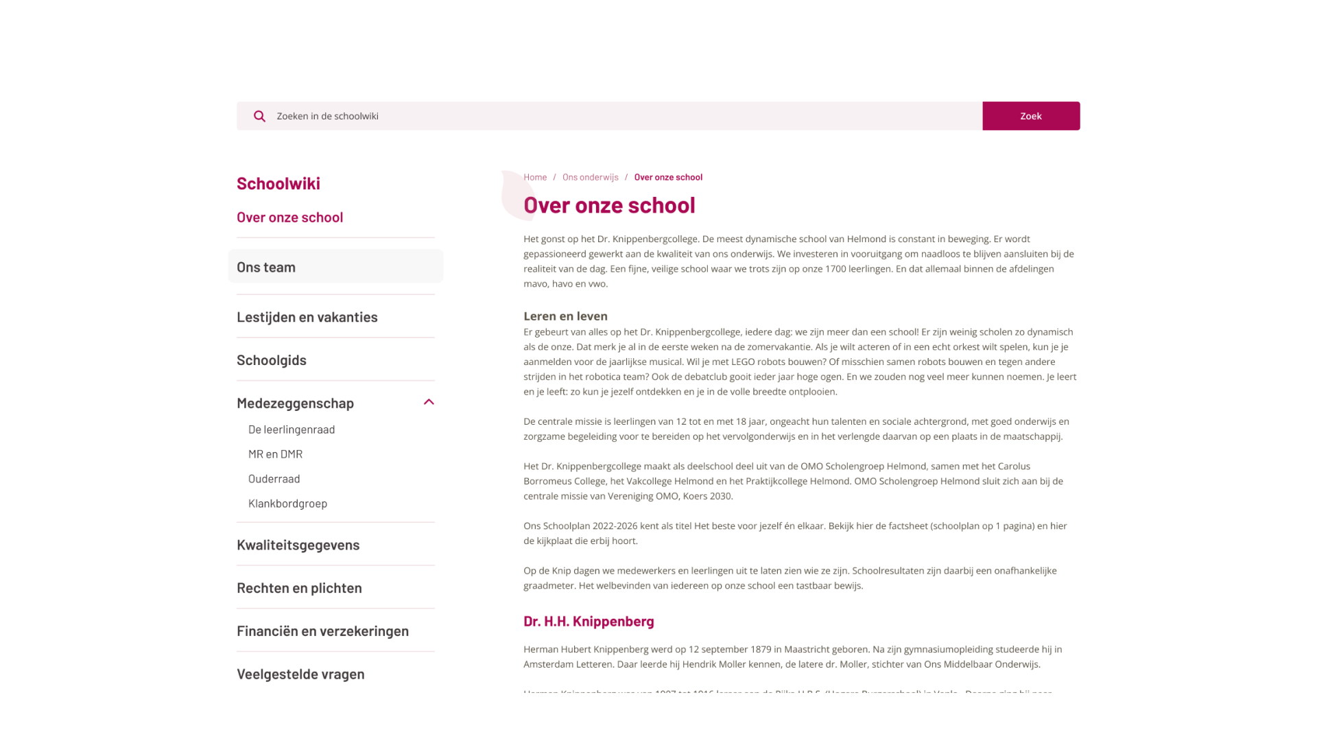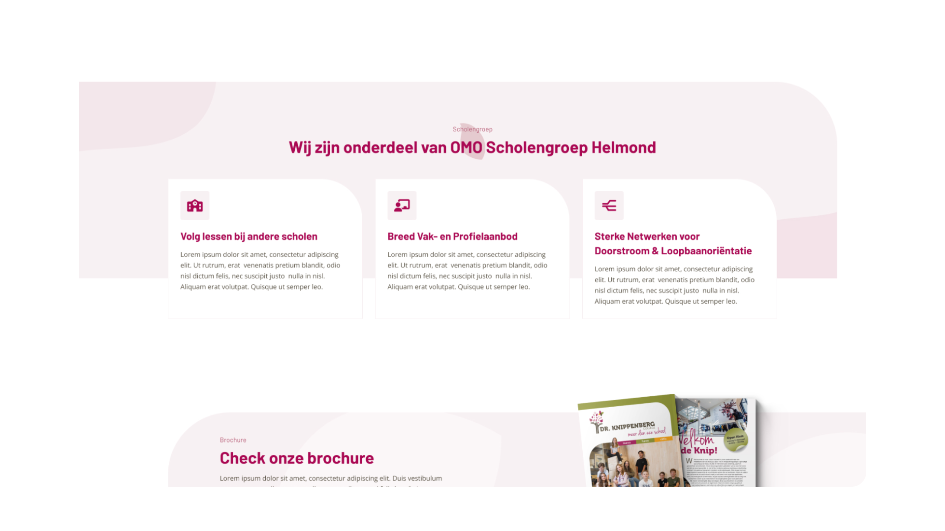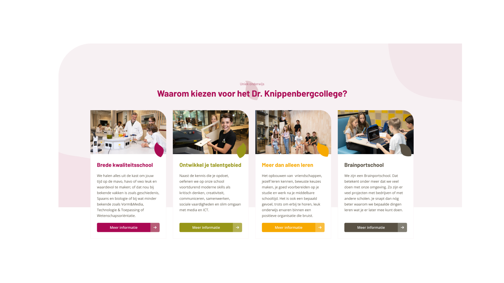 Navigatie en CTA’s sluiten aan op de belangrijkste flows (“Ik ga naar…”, “Ik zit op…”, contact). Het ontwerp blijft consistent binnen de OMO-familie, maar met een eigen uitstraling voor Dr. Knippenbergcollege.