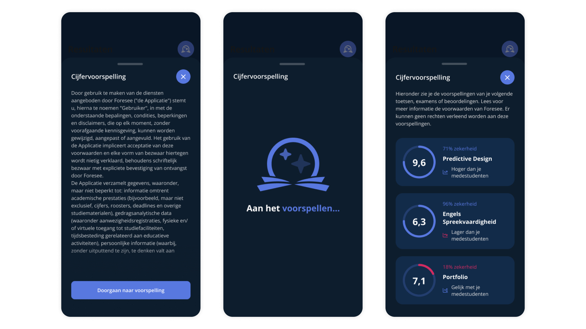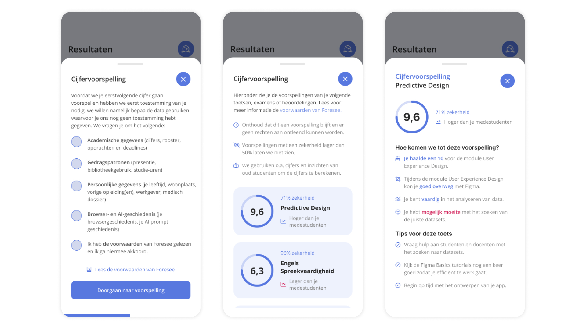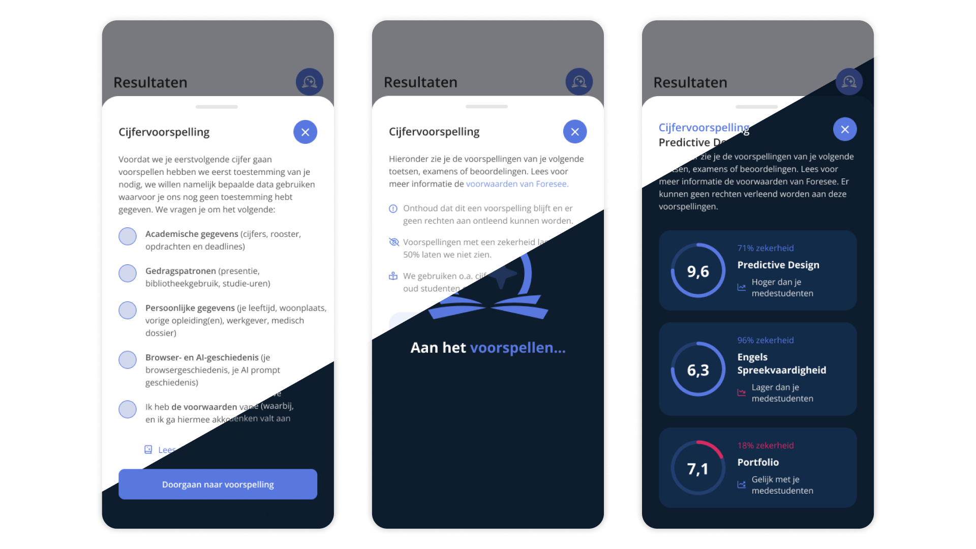 Foresee is een concept voor een mobiele app dat twee uitersten laat zien: een “goede” en een “kwade” versie. De goede versie richt zich op ethische praktijken, waarbij voorspellende inzichten worden gebruikt om studenten te helpen hun academische prestaties te verbeteren, terwijl er wordt gezorgd voor transparantie, privacy en controle voor de gebruiker over hun gegevens. Aan de andere kant laat de kwade versie zien hoe onethische praktijken kunnen leiden tot misbruik van studenteninformatie, zoals het verkopen ervan aan derde partijen of het gebruik van vage termen om gebruikers te manipuleren om meer informatie te delen dan nodig is.