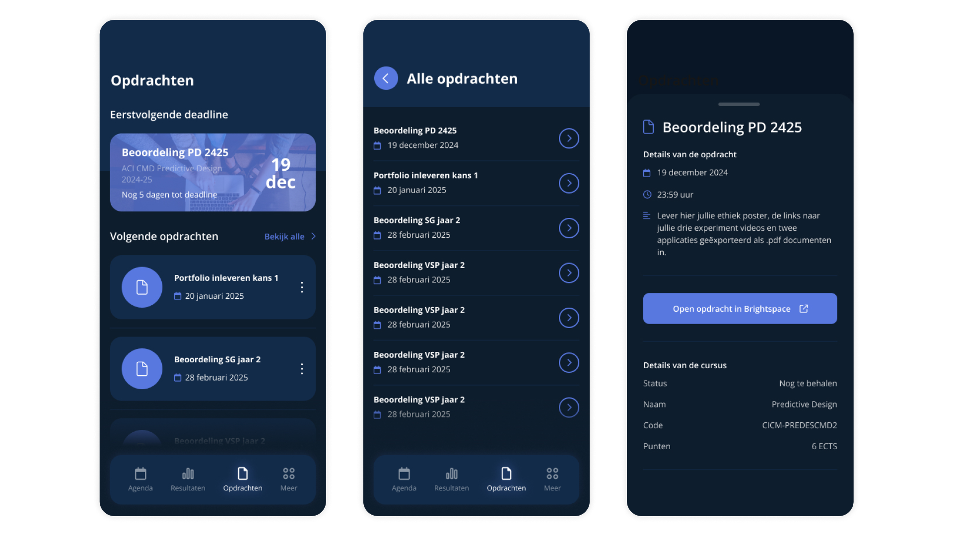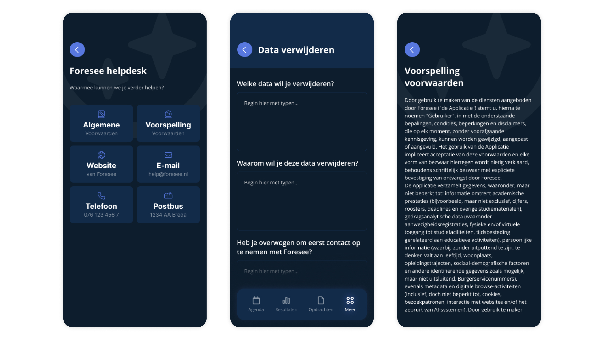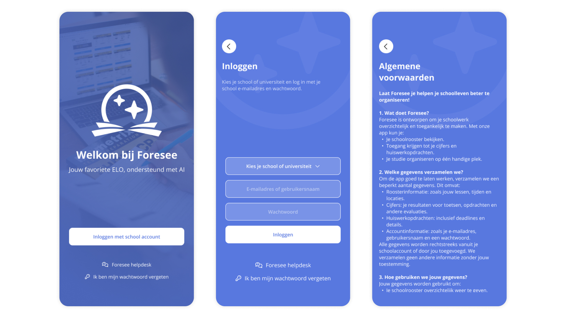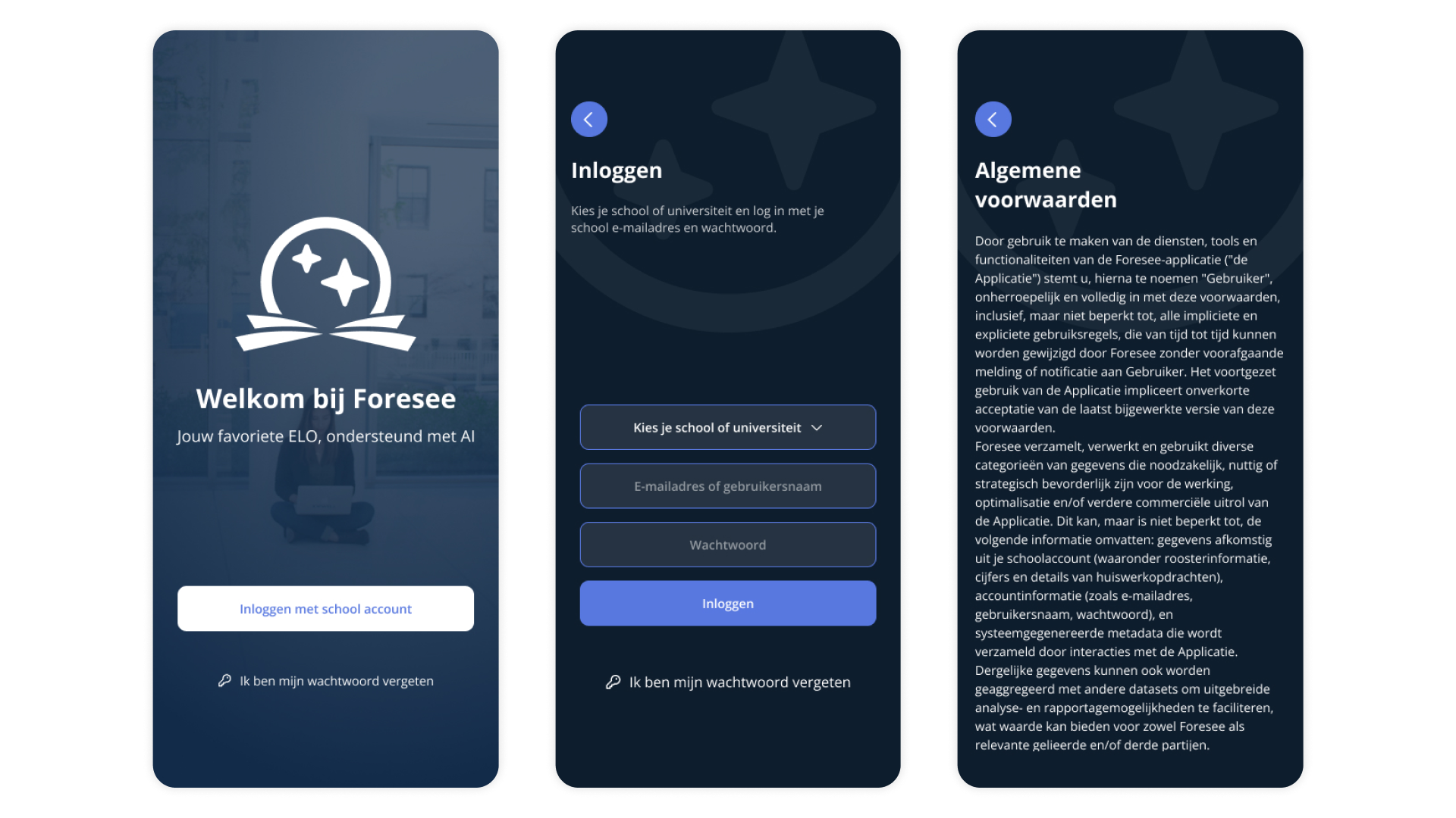 Foresee is een concept voor een mobiele app dat twee uitersten laat zien: een “goede” en een “kwade” versie. De goede versie richt zich op ethische praktijken, waarbij voorspellende inzichten worden gebruikt om studenten te helpen hun academische prestaties te verbeteren, terwijl er wordt gezorgd voor transparantie, privacy en controle voor de gebruiker over hun gegevens. Aan de andere kant laat de kwade versie zien hoe onethische praktijken kunnen leiden tot misbruik van studenteninformatie, zoals het verkopen ervan aan derde partijen of het gebruik van vage termen om gebruikers te manipuleren om meer informatie te delen dan nodig is.