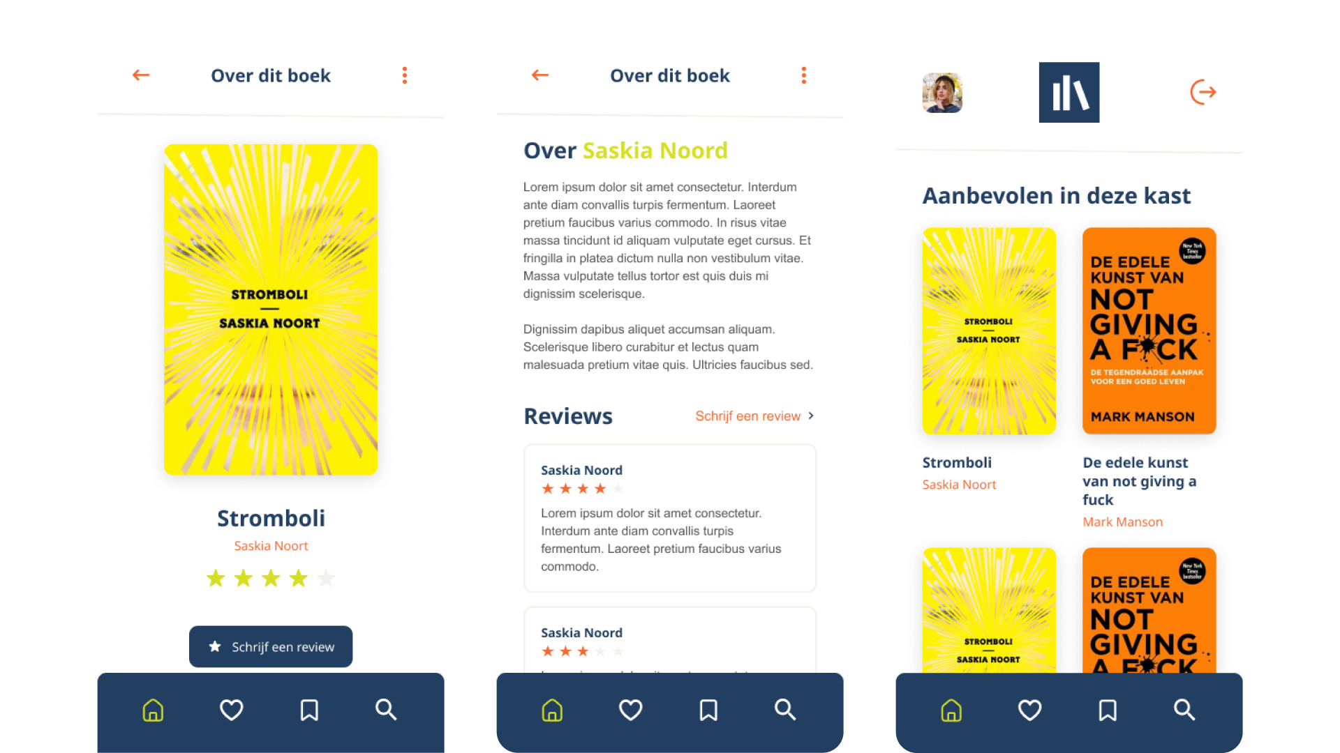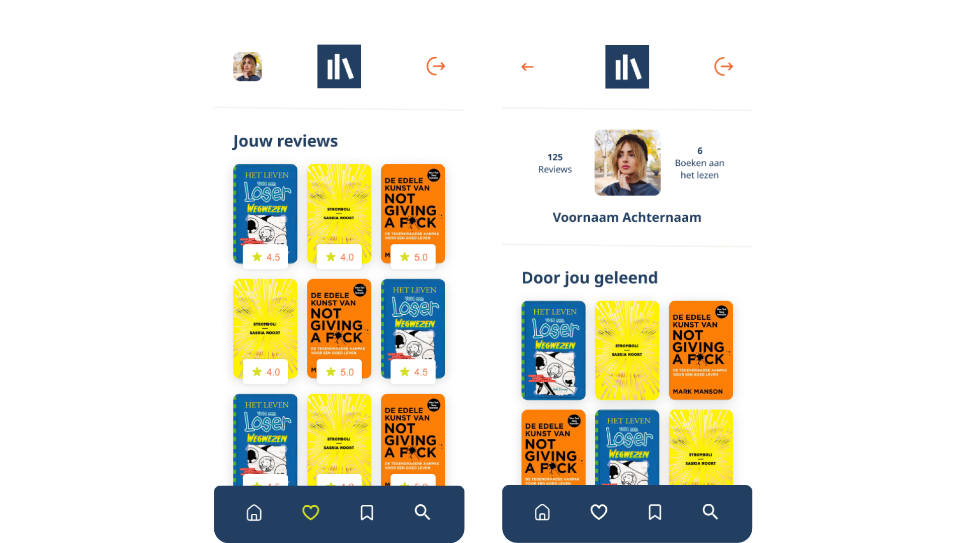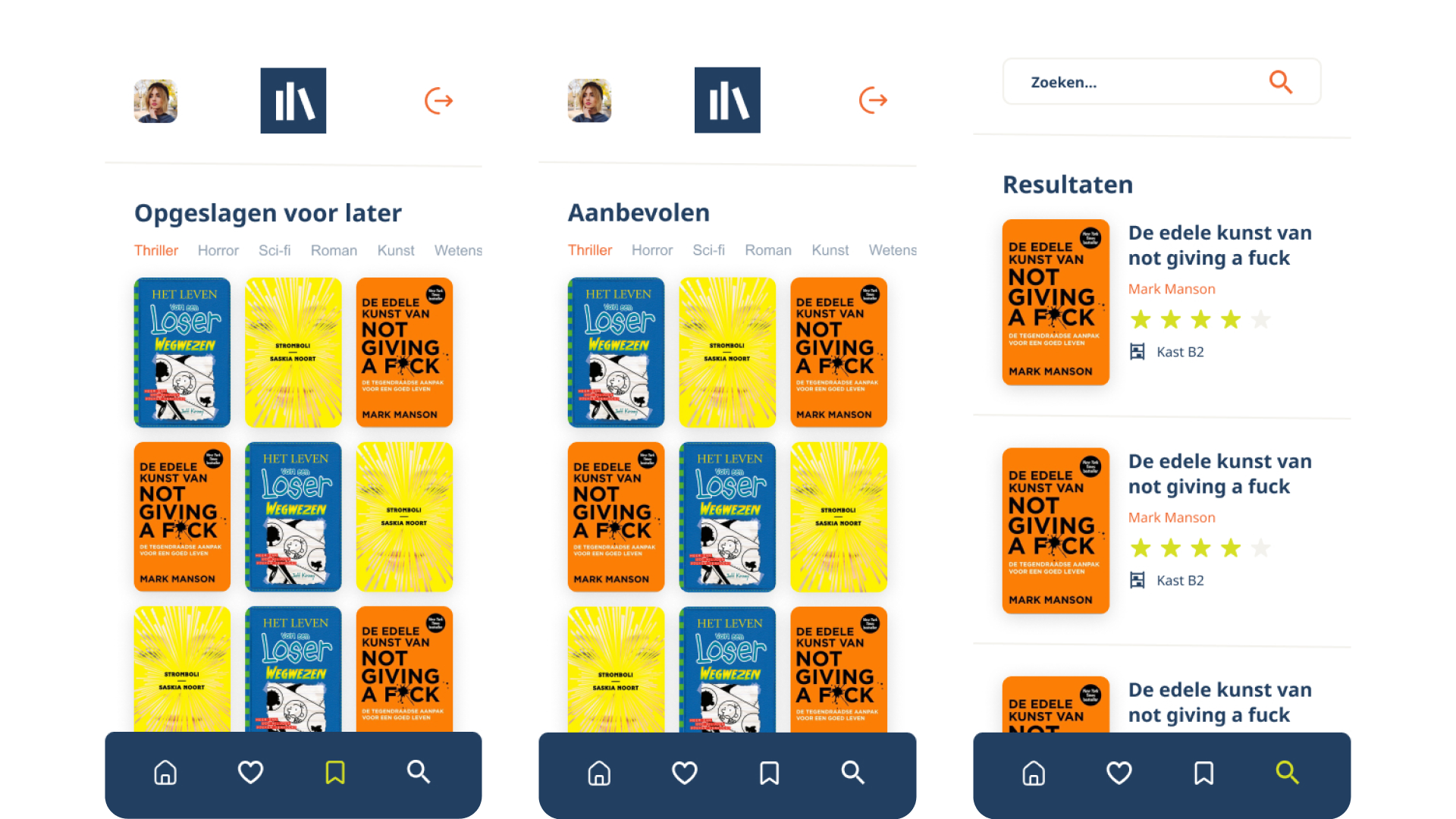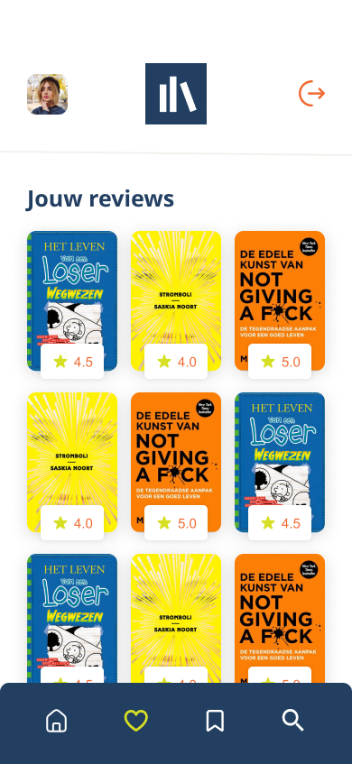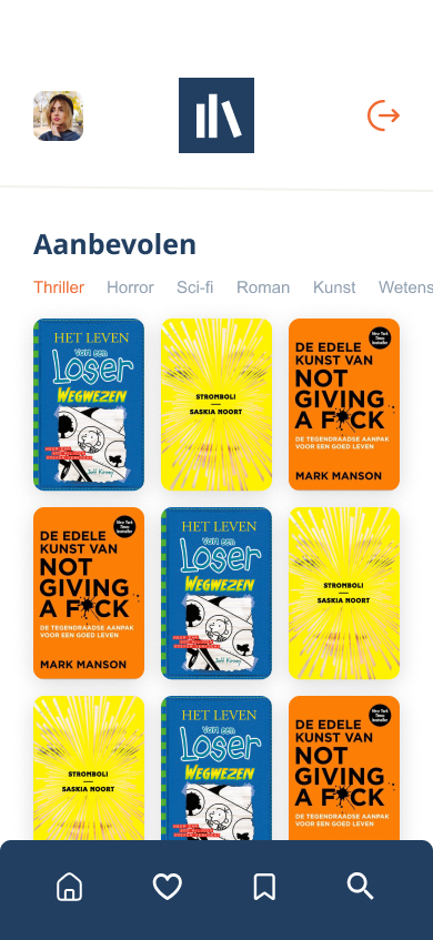 In Figma heb ik een mobiele web-UI ontworpen met duidelijke hiërarchie, grote kaften en korte beschrijvingen zodat de focus op het boek ligt.
